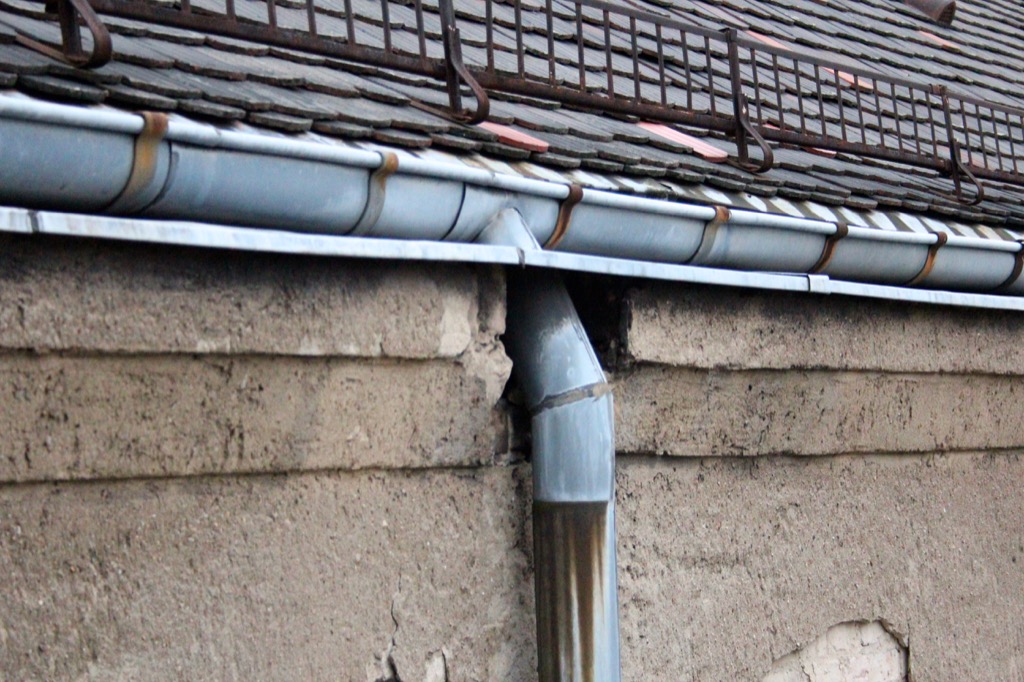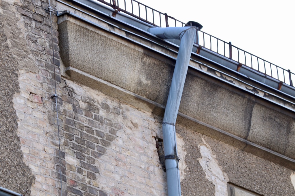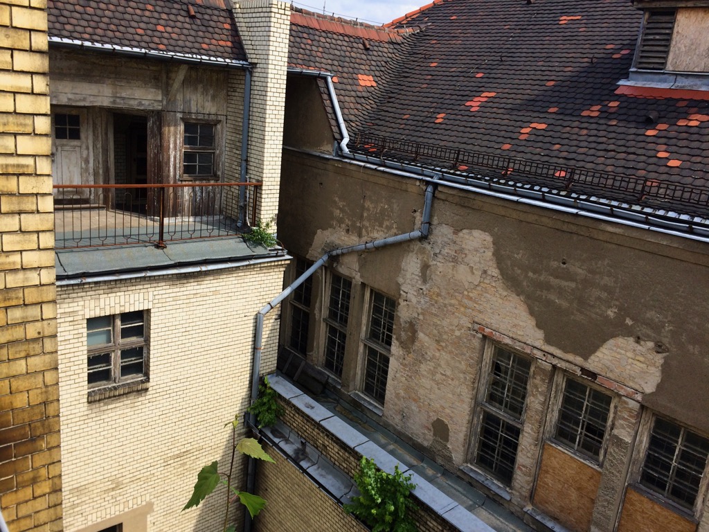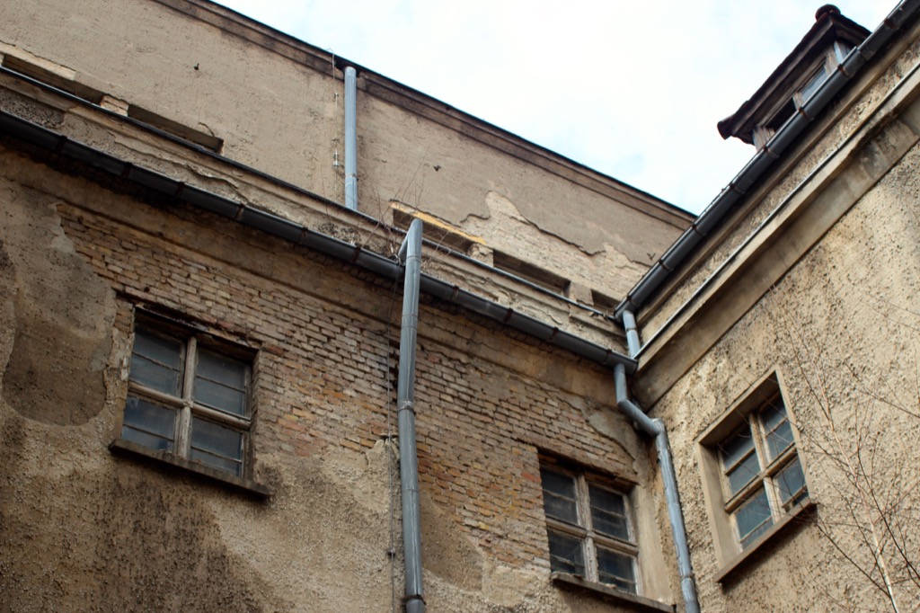 Demzufolge sind natürlich bei einem Leerstand von nun 25 Jahren und einer sträflich vernachlässigten Wartung all diese Elemente durchlässig geworden und verursachen die Feuchteschäden die natürlich zum Durchnässen der Wände und bei Frost zu Abplatzungen des Innen- und Außenputzes führen. Und das ist nur das Erscheinungsbild der Außenfassade, im inneren sind die Feuchteschäden ebenfalls zu sehen. Diese Bilder wurden vor wenigen Tagen aufgenommen, wie es im Inneren aussieht haben wir ein letztes Mal im November 2014 gesehen. Auch haben wir nicht den Bauzustand des Innenhofes gesehen, es sah damals aber nicht anders aus. Zum Teil fehlten sogar die Fallrohre ganz. Hier einige Bilder des Innenhofes aus dem Jahr 2014.