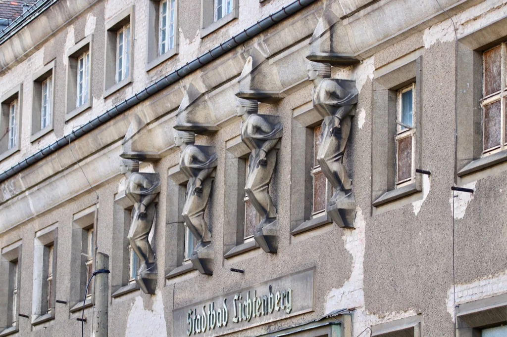 Ludwig Isenbeck, geboren am 19. April 1882 und verstorben am 21. Dezember 1958, gehört zu den drei Künstlern, die dem Stadtbad Lichtenberg ihren unverwechselbaren künstlerischen Ausdruck verliehen. Sein Todestag jährte sich vor wenigen Tagen zum sechzigsten Mal – ein Anlass, sein Wirken und insbesondere seine Arbeiten am ehemaligen Volksbad Lichtenberg erneut in den Blick zu nehmen. Die von Isenbeck entworfene Darstellung einer startenden Wasserspringerin prägt bis heute den Haupteingang des Stadtbades. Viermal brachte man die Figur an der Fassade an – als bewusste Gestaltung der Stadt Berlin, die damit nicht nur auf den Badebetrieb hinweisen wollte, sondern zugleich den damaligen Aufbruch in eine neue Zeit visualisierte. Dieser Gedanke spiegelt sich vor allem in der expressionistischen Formensprache wider: Die kantigen, gezackten Linien der Skulptur verleihen ihr eine Dynamik, die den modernen Zeitgeist der 1920er Jahre eindrucksvoll zum Ausdruck bringt.