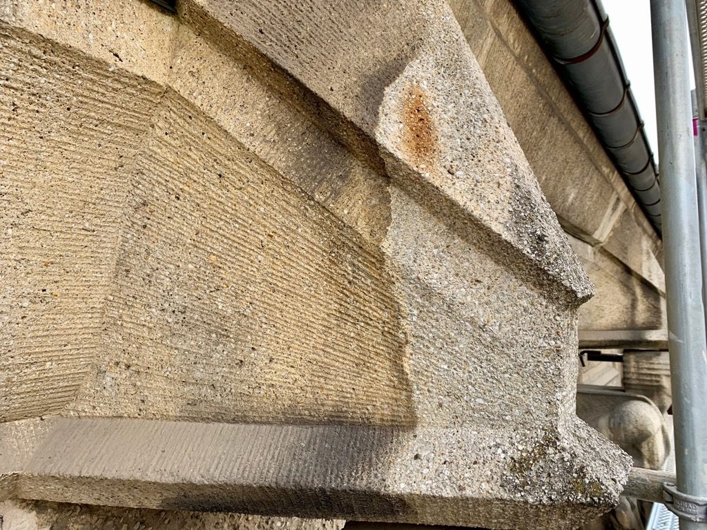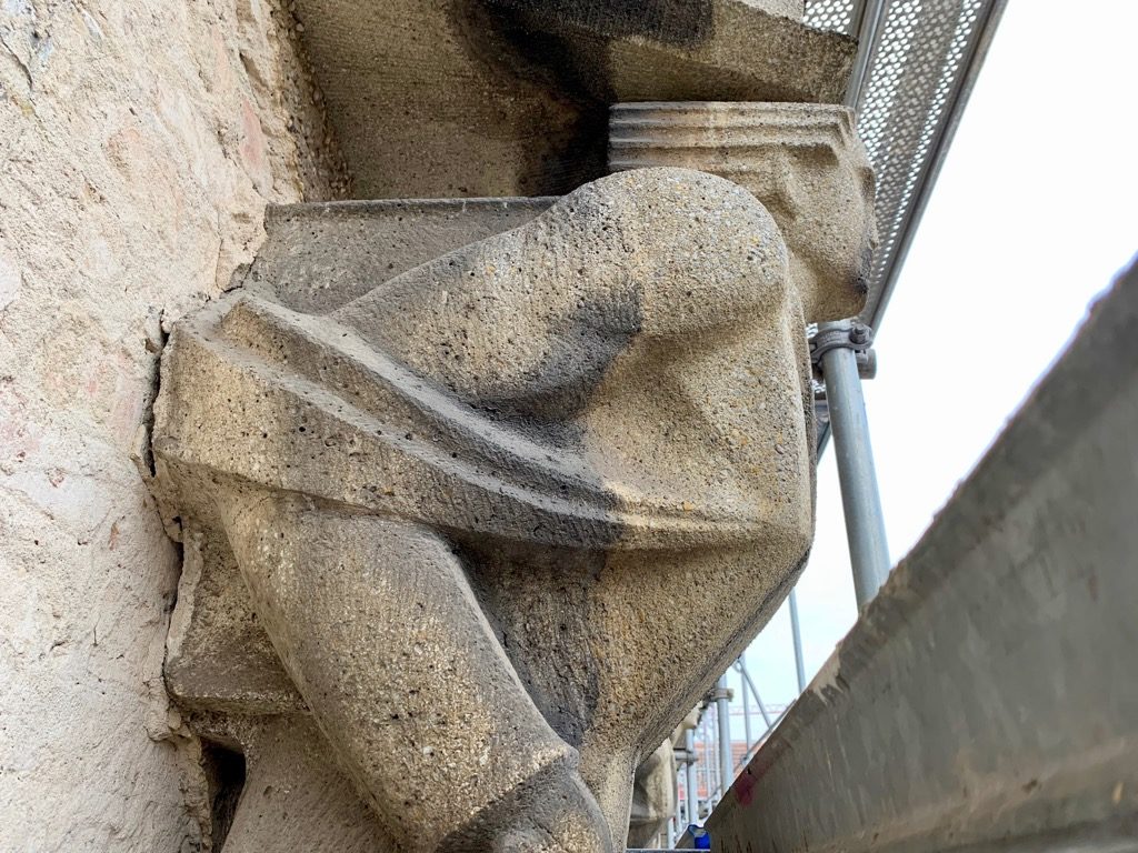 Die witterungsbedingten Schäden sind bei den 90jährigen Figuren recht deutlich. Regen und Frost haben zu Auswaschungen und Rissbildung geführt.