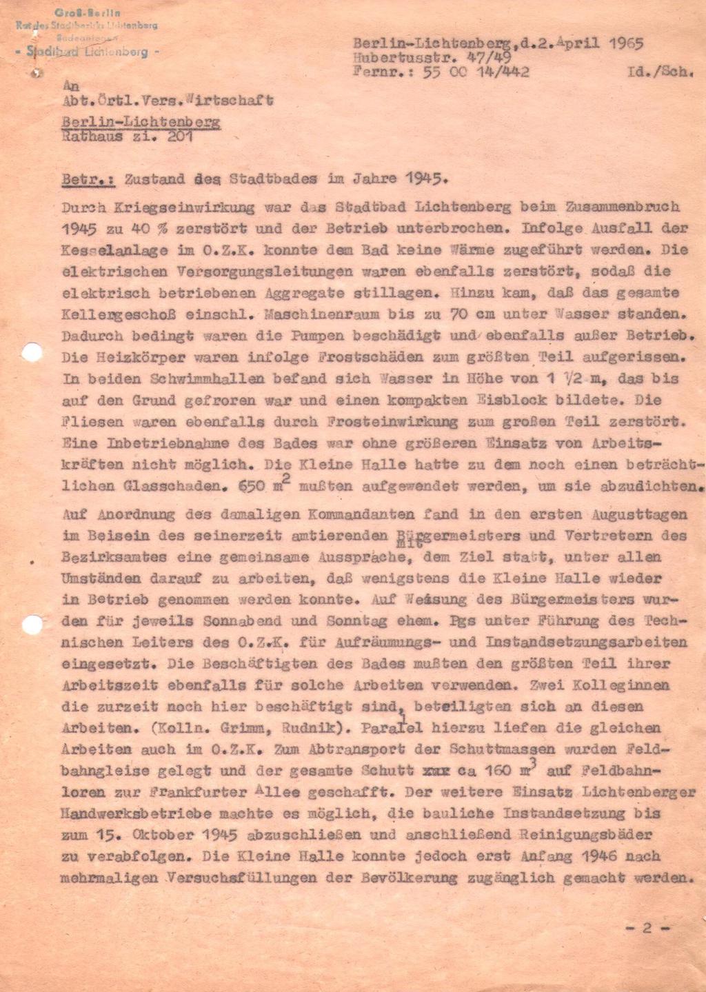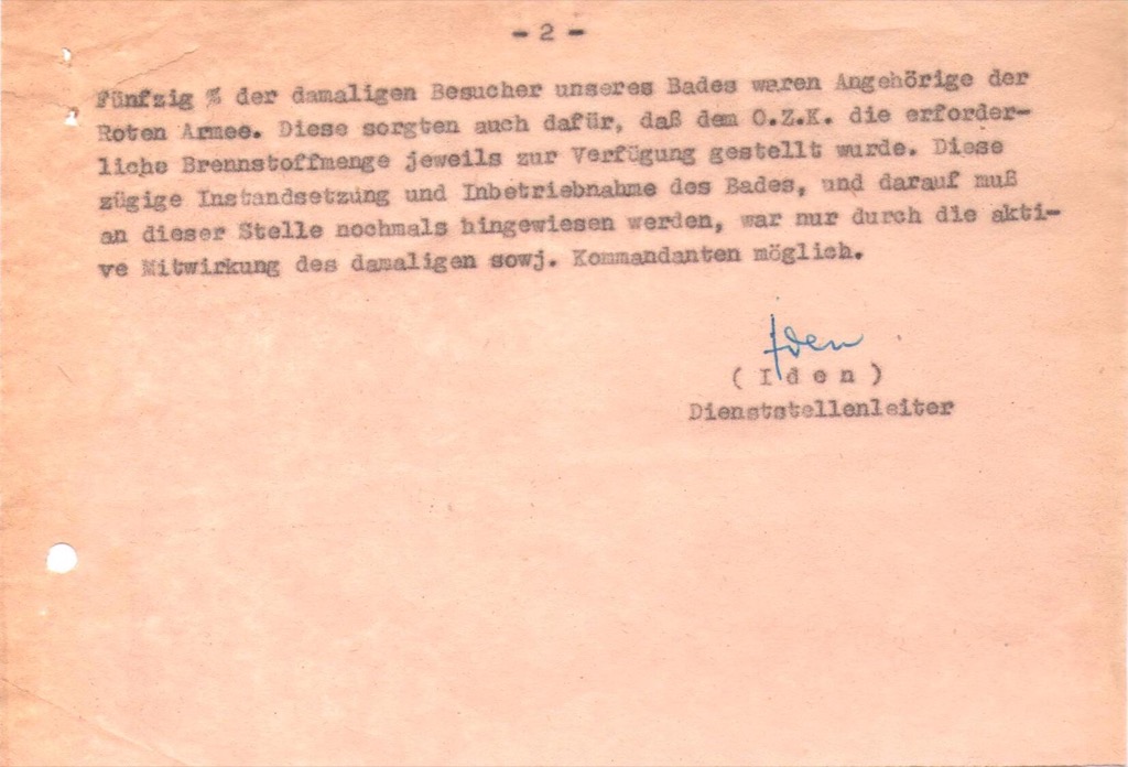 In einem Dokument vom April 1965 wird der Zustand des Bades im Jahr 1945 beschrieben.