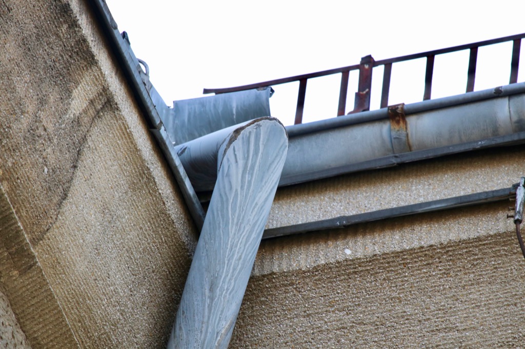 Gut sichtbar sind allerdings auch die massiven Feuchteschäden die durch nicht ordungsgemäße Wartung der Dachrinnen und Dacheinhangbleche verursacht wurden. In den 60iger Jahren wurde zur Zeit der DDR das ganze Entwässerungssystem umgebaut. Viele jetzt sichtbare Dachrinnen existierten in der jetzigen Form nicht. Man hatte sich im Ursprung bei der Regenwasserableitung für ein sogenanntes Inneres Regenwasser-Entwässerungssystem entschieden. Das bedeutet, das anfallende Regenwasser wurde von den Hauptdächern auf die Attika der Hallen geleitet und über ein Rinnensystem durch das Innere des Hauses abgeführt. Die zu DDR-Zeiten verwendeten Rinnen, Rinneneisen und Rinnenbleche hatten keine so gute Qualität. Auch das handwerkliche Geschick lies zu Wünschen übrig. Hier einige Eindrücke