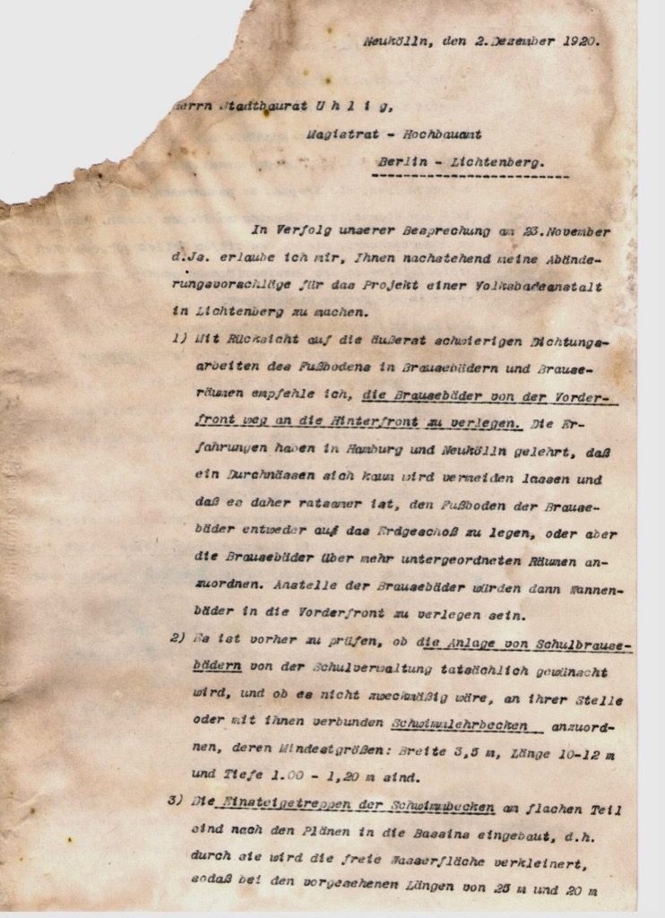 Der Vergleich der uns seit einiger Zeit vorliegenden Zeichnungen mit den aufgefundenen Zeichnungen aus dem Jahr Juli 1919 läßt erkennen, dass im Juli 1919 intensiv an der Planung gearbeitet wurde. Vom Kellerbereich und vom Eingangsbereich liegen uns verschiedene Ausführungszeichnungen aus dem Juli 1919 vor. Auch ist dem Schriftverkehr zwischen Herrn Samtleben und Herrn Uhlig zu entnehmen, dass im letzten Halbjahr 1919 bis Ende 1920 auf der Baustelle “Volksbadeanstalt Lichtenberg” wahrscheinlich gearbeitet wurde. Wie dem weiteren Schriftverkehr zu entnehmen ist, hat der Stadtbadleiter von Neu-Köln Herr Samtleben vorgeschlagen eine Besprechung über die weitere Planung des Bades durchzuführen. Diese fand am 23. November 1920 im Bauamt Lichtenberg statt.