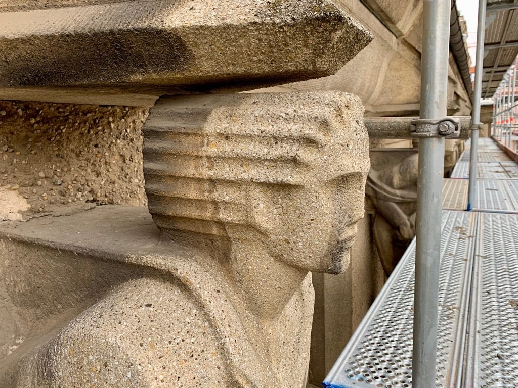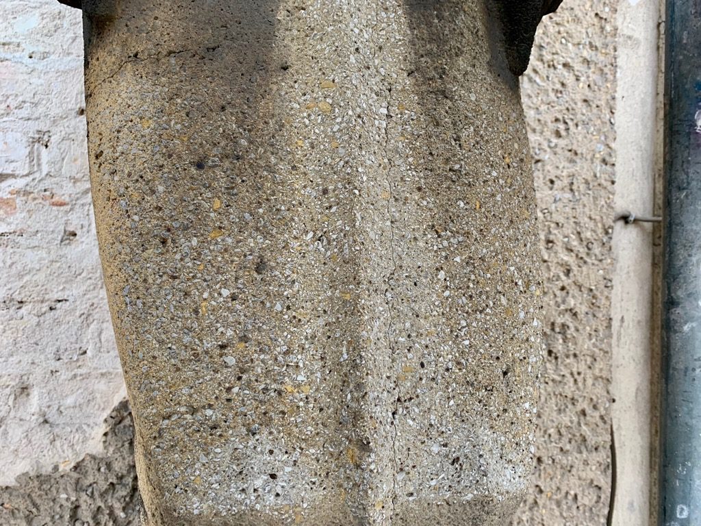 Die witterungsbedingten Schäden sind bei den 90jährigen Figuren recht deutlich. Regen und Frost haben zu Auswaschungen und Rissbildung geführt.