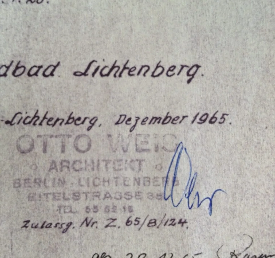 Einen außergewöhnlichen Quellenwert besitzt darüber hinaus ein privates Vermächtnis, das die Geschichte des Stadtbads unmittelbar berührt. Kurz vor dem Weggang von Otto Weis soll er persönliche Unterlagen zum Stadtbad Lichtenberg an die Familie Nispel und späteren Stadtbadleiterin Frau Nispel übergeben haben. Zu diesem Konvolut gehören nach der Überlieferung ein Fotoalbum mit Originalaufnahmen aus dem Jahr 1928 – also aus der Eröffnungszeit – sowie mehrere Originalzeichnungen auf Pergament zur Innengestaltung der Schwimmhallen, versehen mit seiner Unterschrift sowie Fotoplatten vom Flussbad Lichtenberg. Diese Unterlagen befinden sich heute im Privatbesitz. Für die Bau- und Denkmalgeschichte ist das ein seltener Glücksfall: Originalfotografien und signierte Innenraumzeichnungen können Ausführungsdetails, gestalterische Absichten und die ursprüngliche Raumwirkung dokumentieren, die später – etwa durch Reparaturen, Modernisierungen oder veränderte technische Anforderungen – oft nur noch schwer zu rekonstruieren sind.